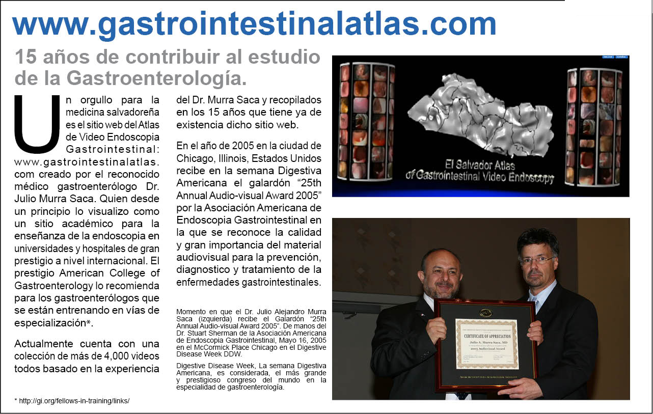 Por primera vez, el premio anual audiovisual de la Asociación Americana de Endoscopia sale de las principales universidades de los Estados Unidos y el año 2005 fue otorgado al Dr. Julio Murra Saca de la República de El Salvador, Un Galardón a nivel mundial.